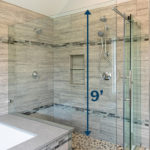 Tile Baseboard-bath:3 3 1/4″ high Matches your floor tile and floor grout selection Lined with modern Schluter edging Mayflower Vertical Accent Line-bath:3,R9′ Floor to Ceiling Wall Tile-bath:2,3