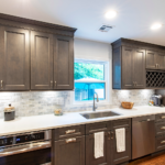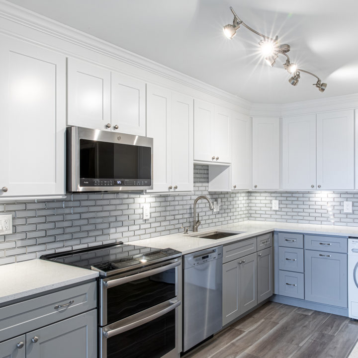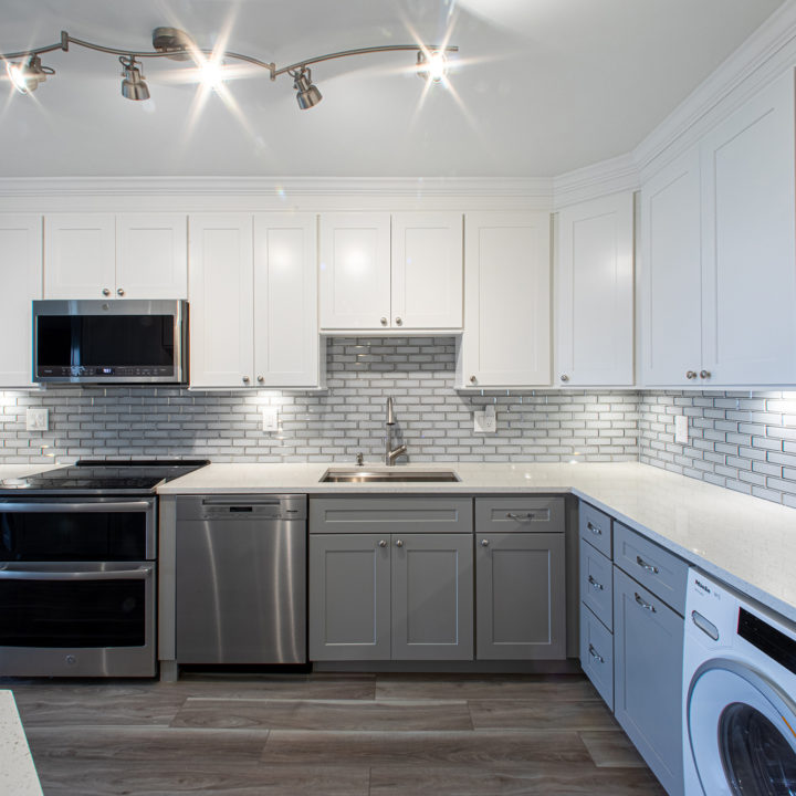 If you want a subtle dual-colored kitchen, white and light gray pair wonderfully. Continue the color coordination by choosing a white quartz countertop and subway backsplash tile.