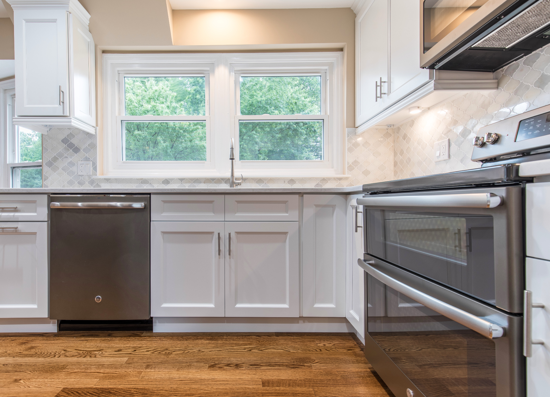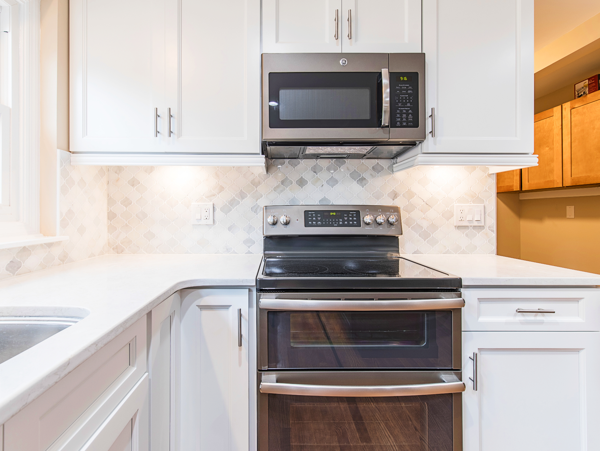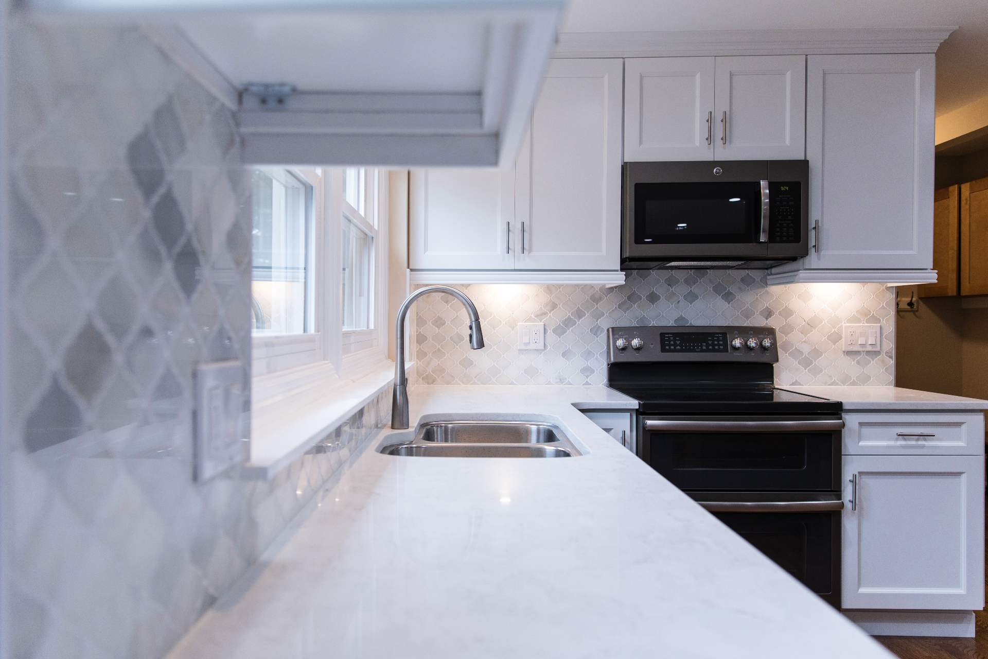 Timeless white cabinetry gives you a mix elegance and posh look.