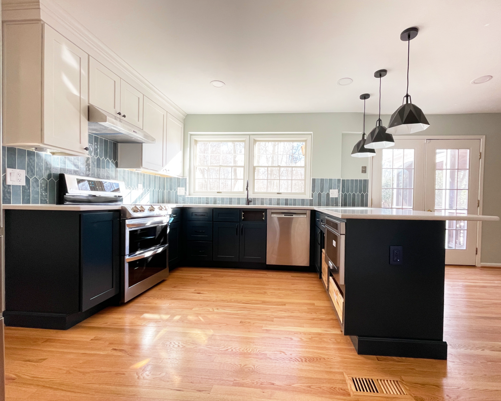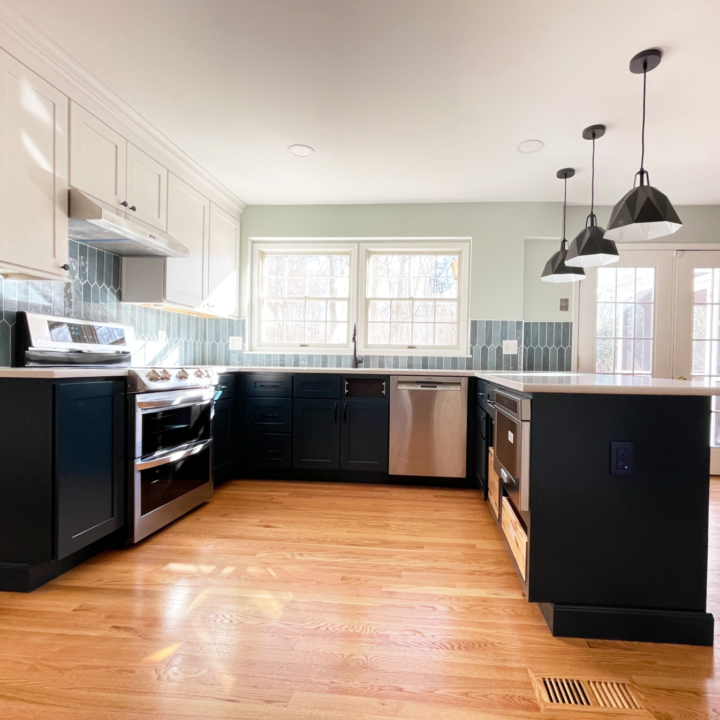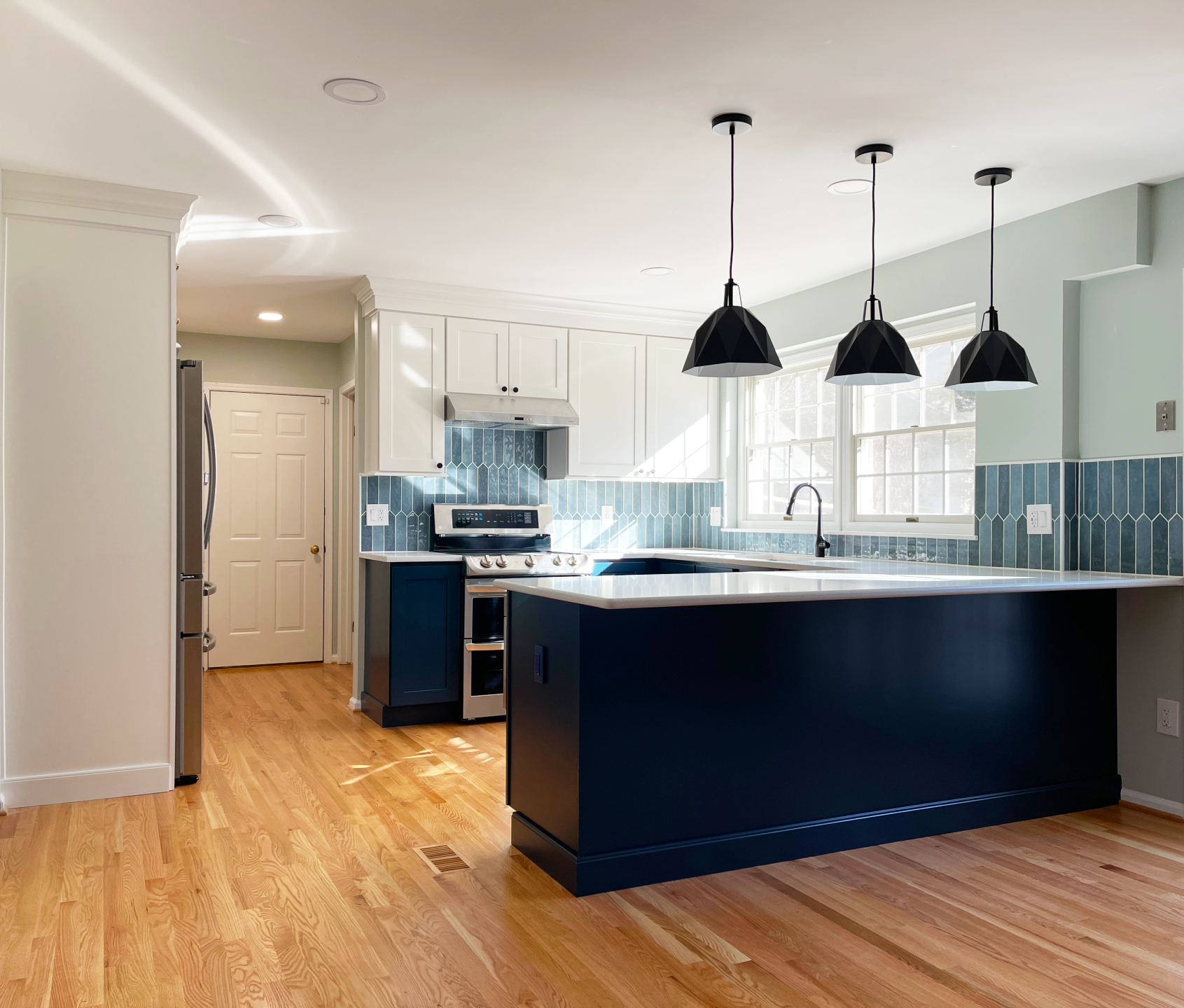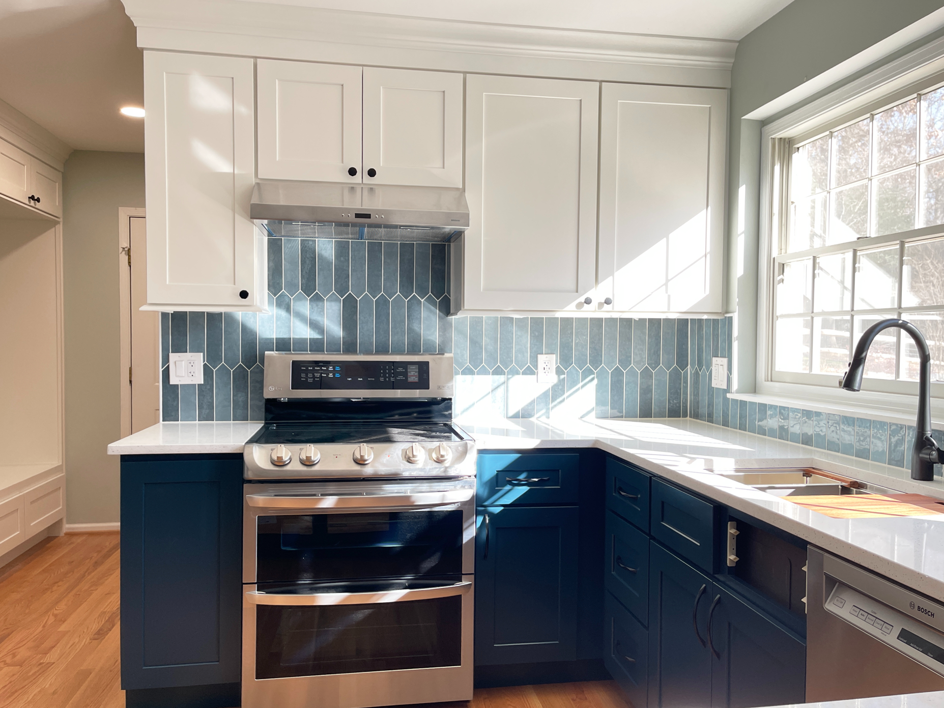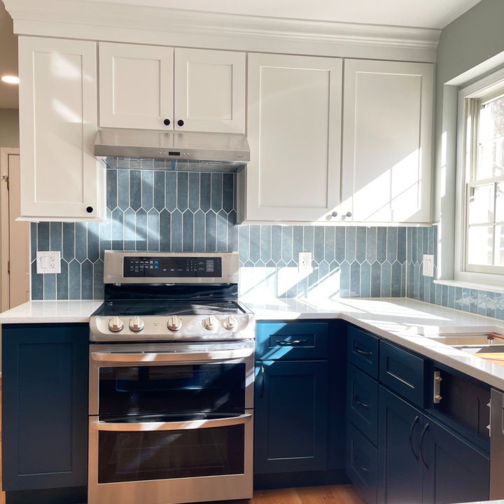 & blue lagoon cabinetry with denim pickett backsplash