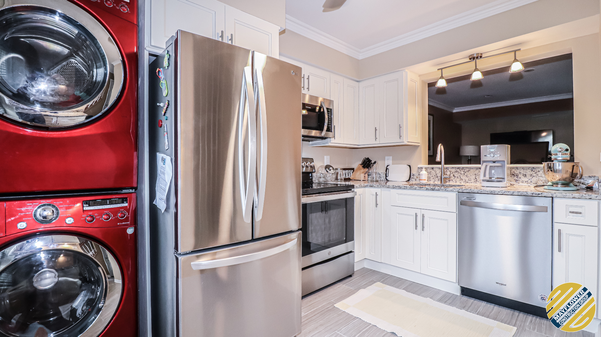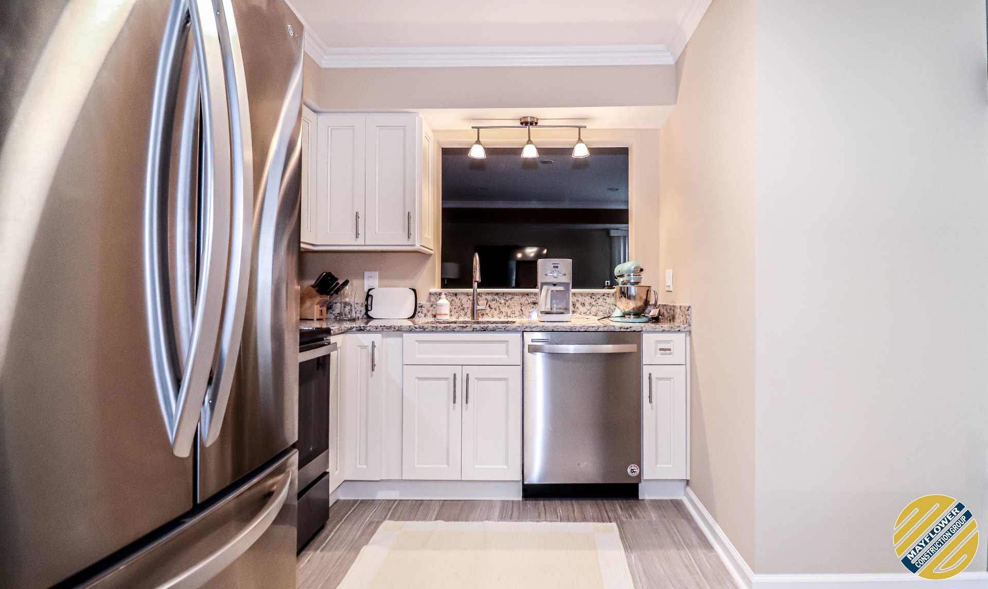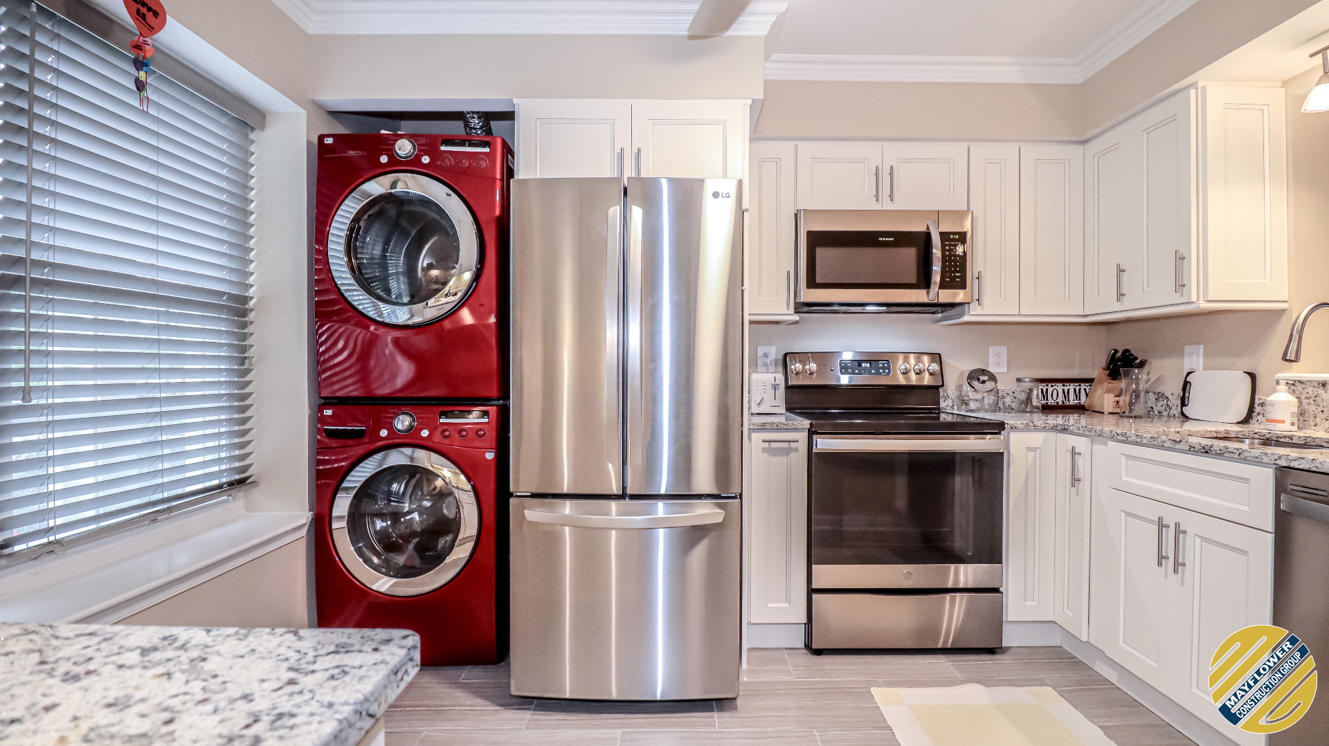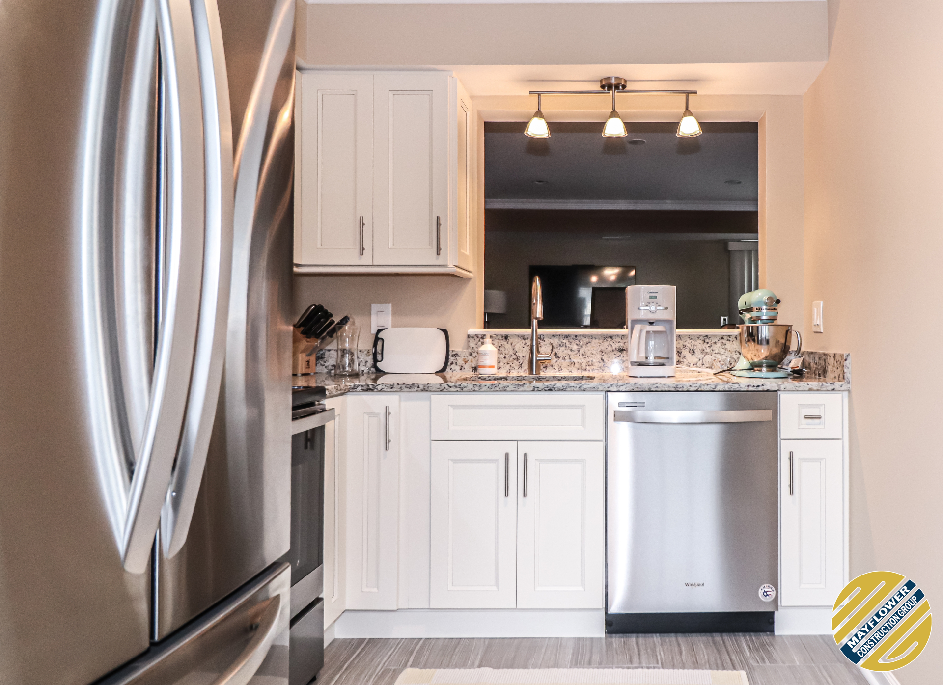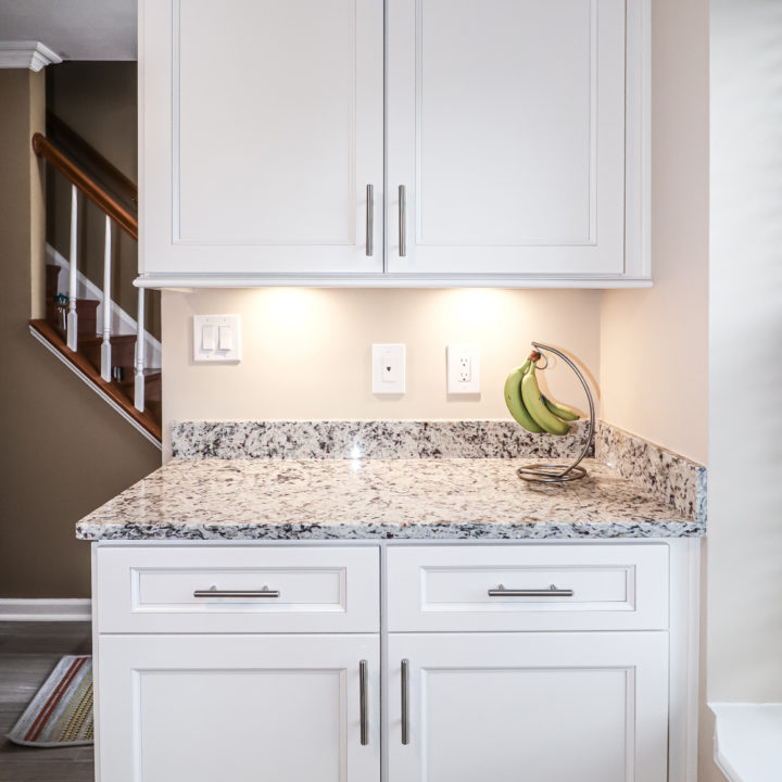 Granite countertop matched with dallas white backsplash and brushed nickel fixtures