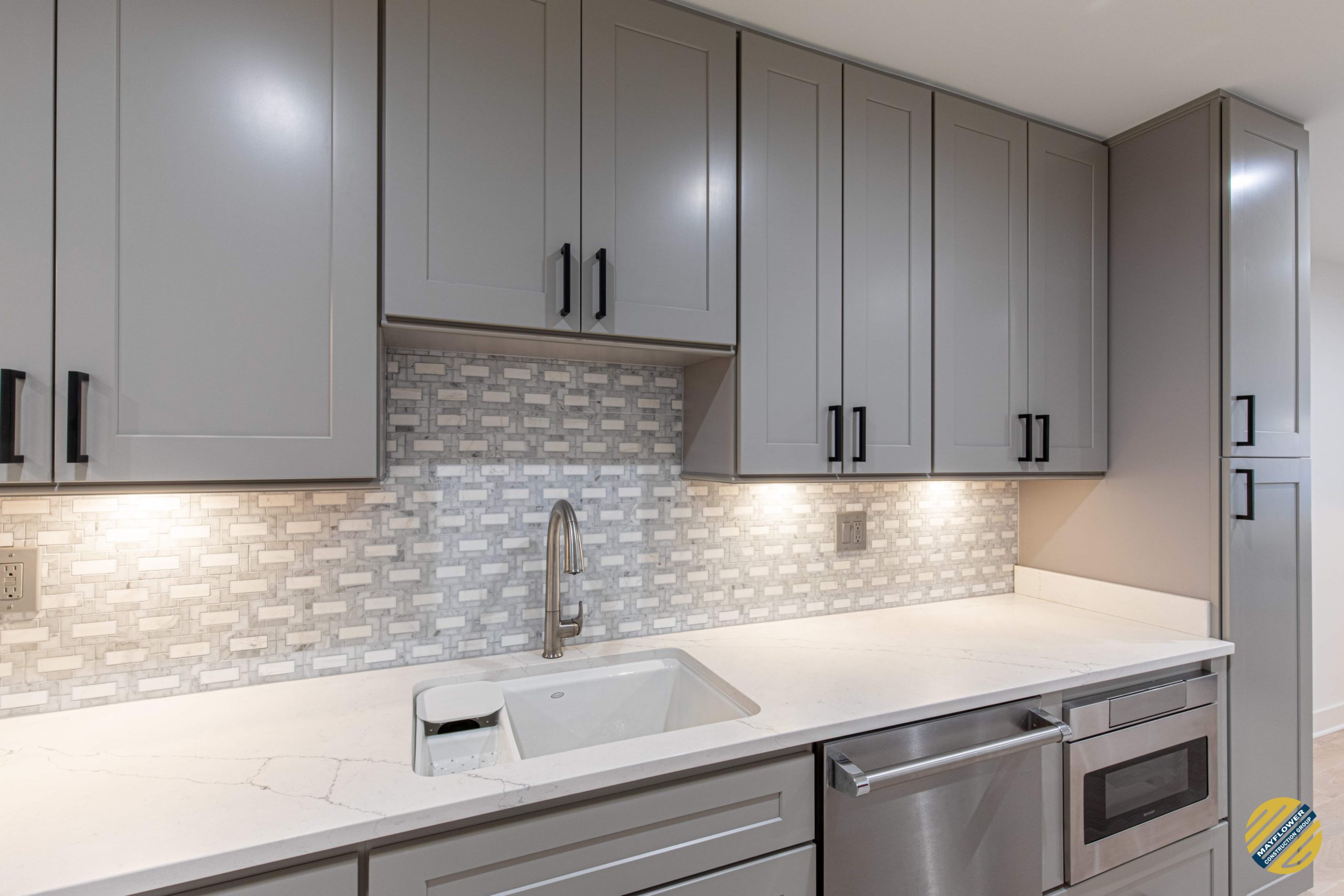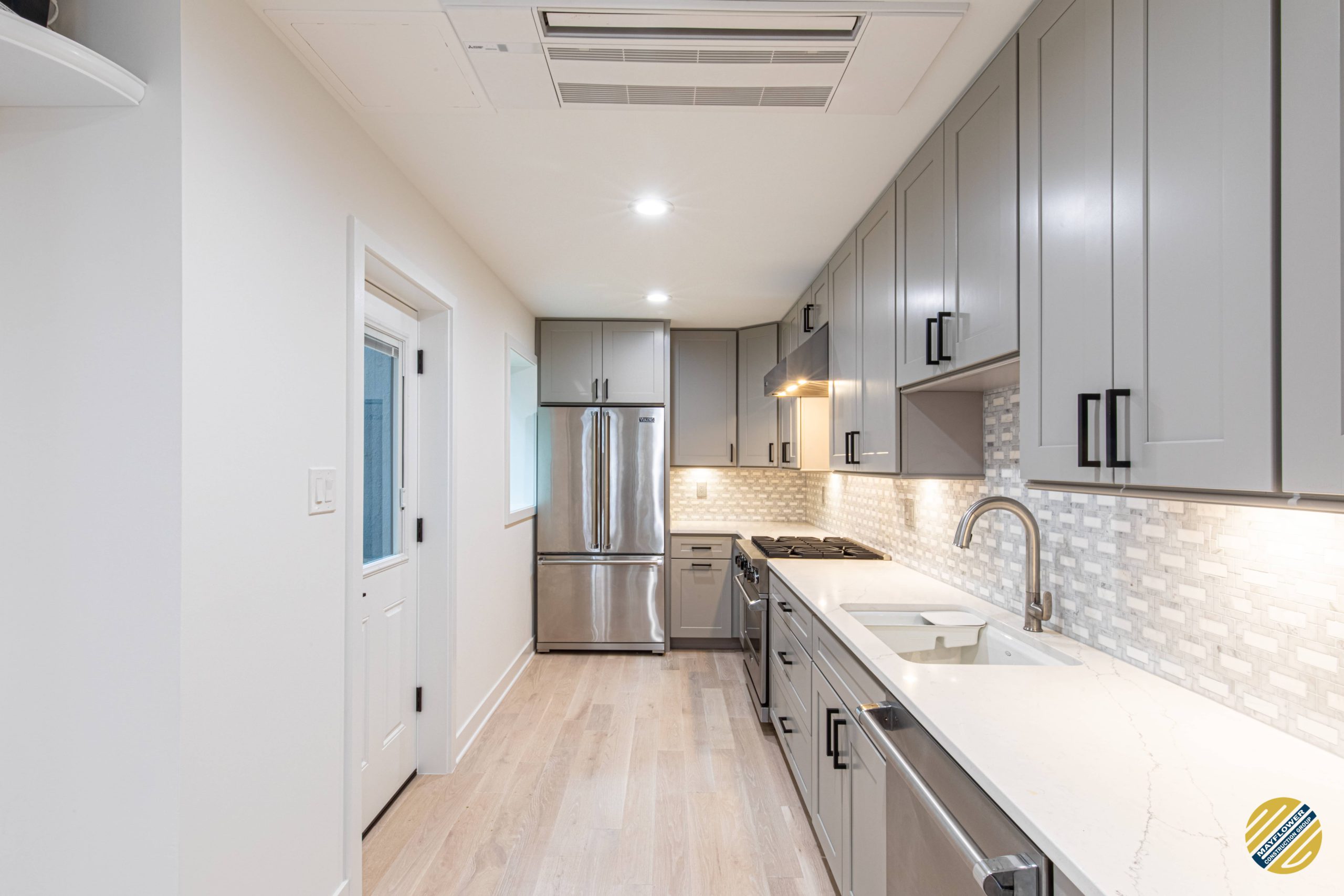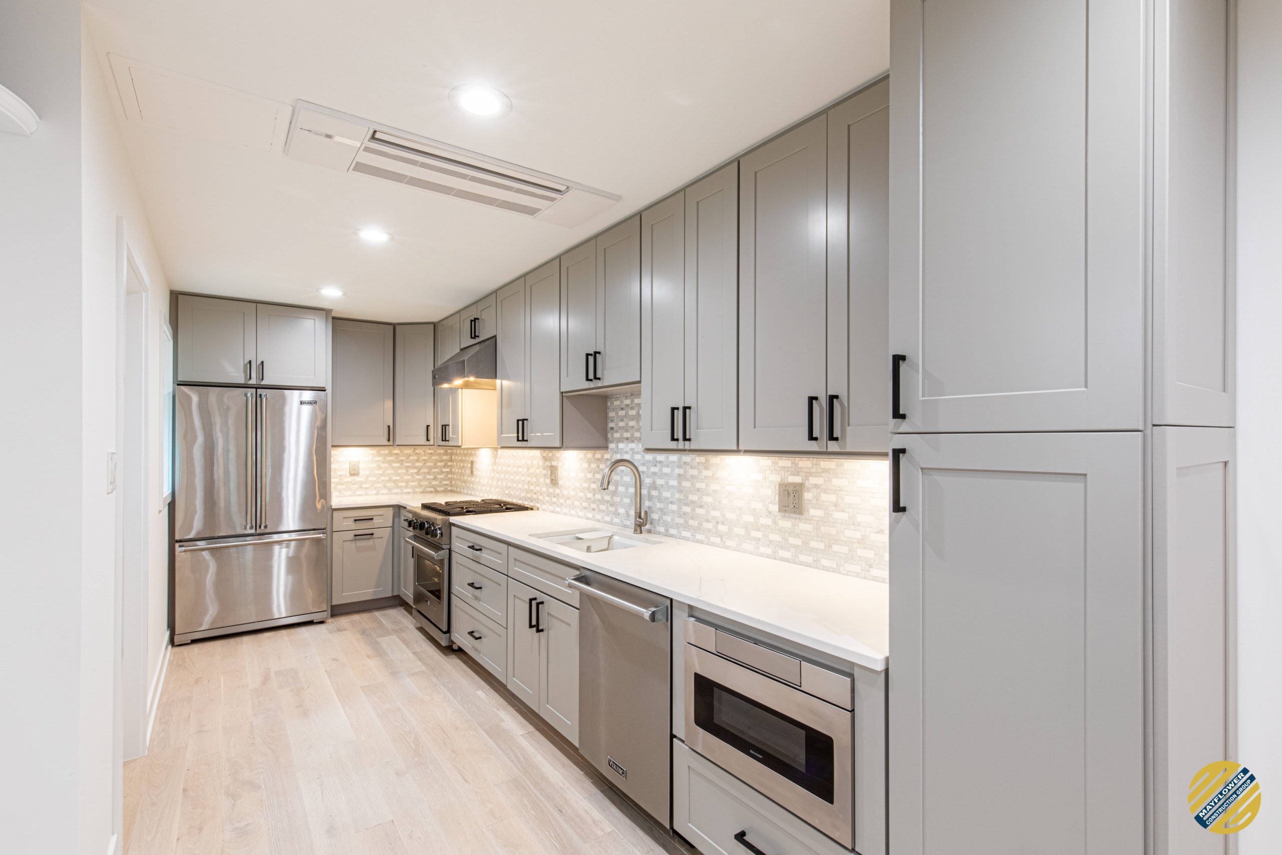 Accentuating kitchen with stainless steel appliances and light grey cabinets