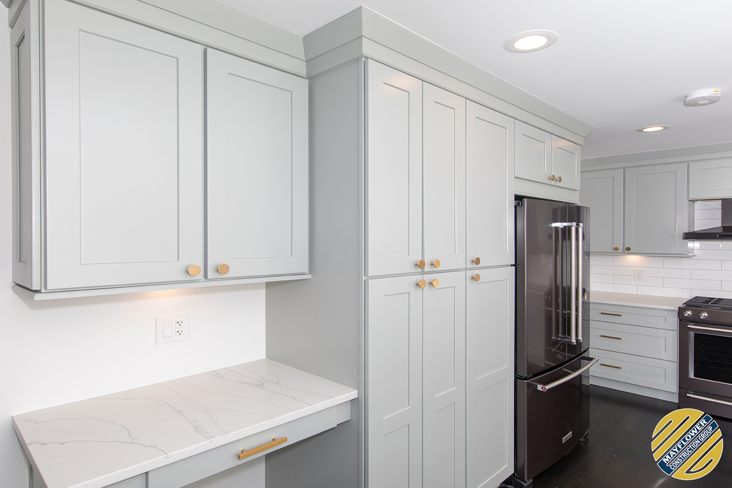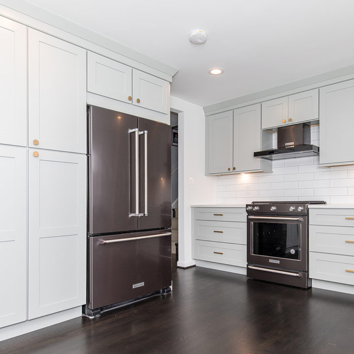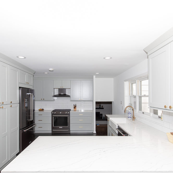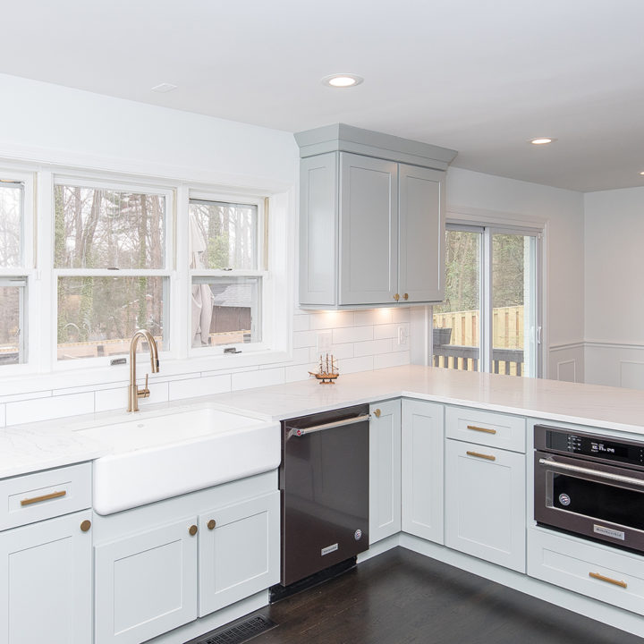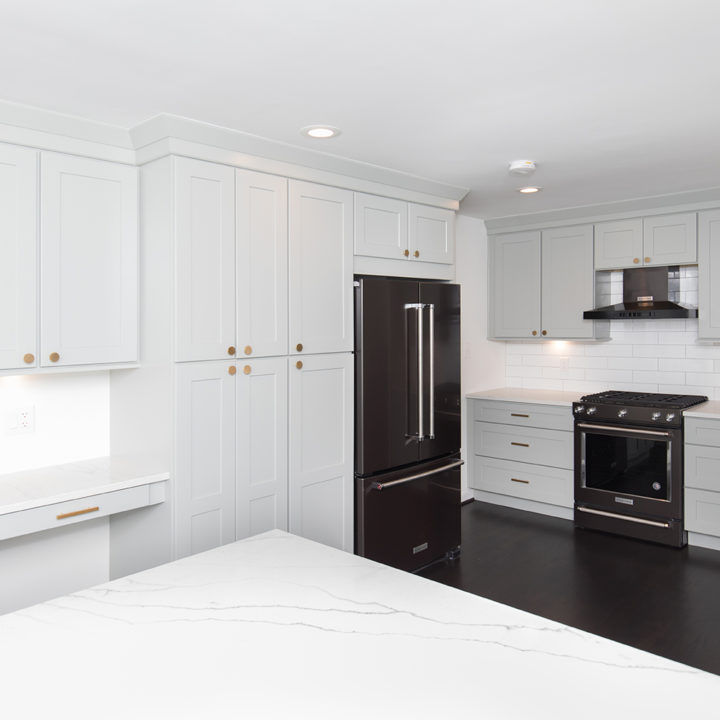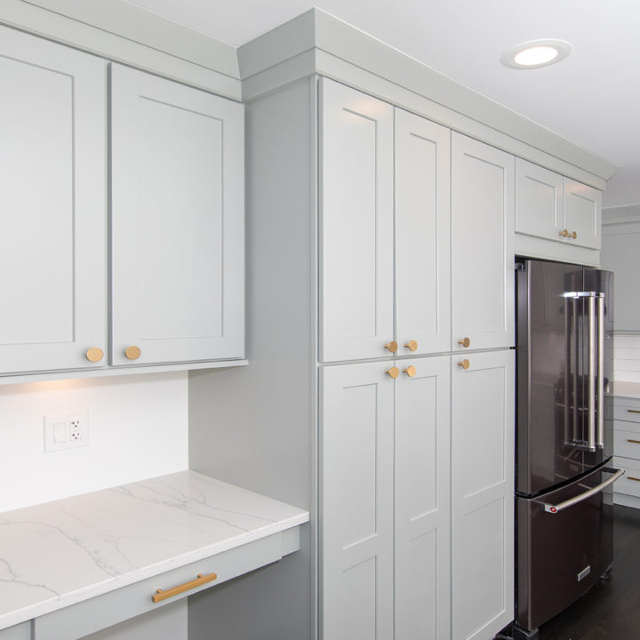 Light green shaker cabinets paired well with marble toned quartz and white large format subway tile backsplash.