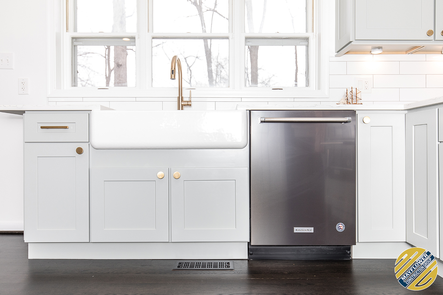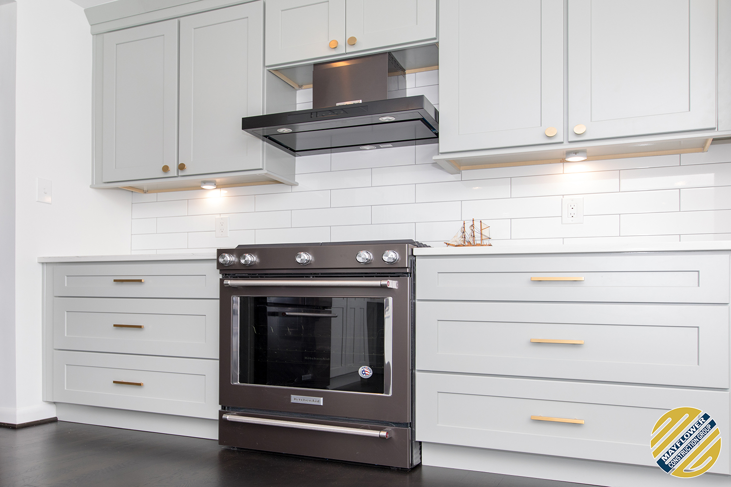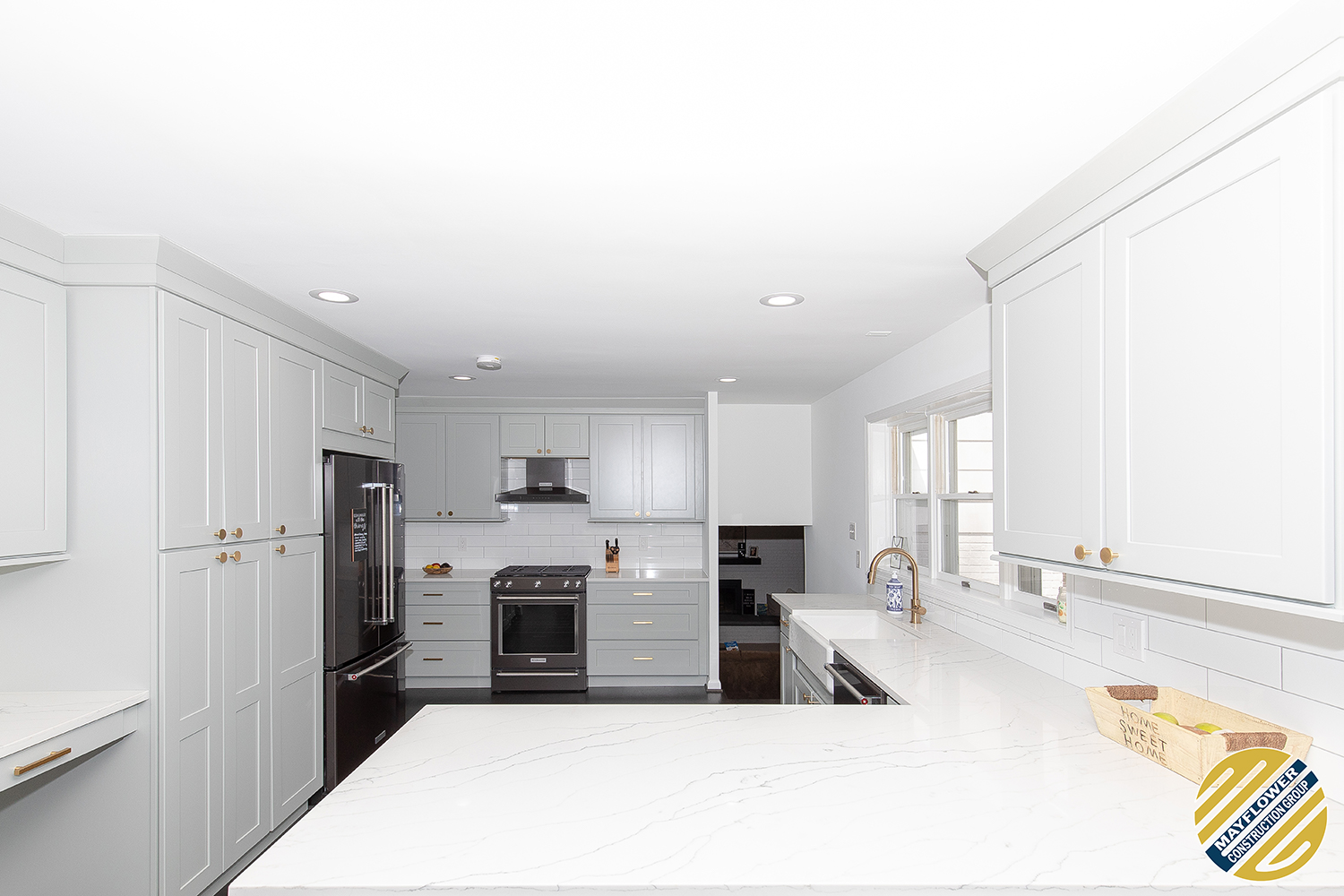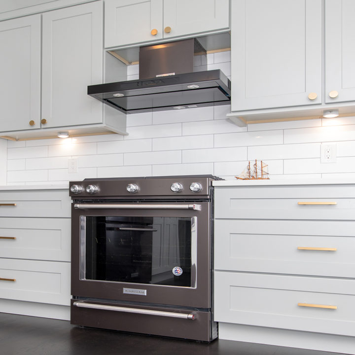 Light green shaker cabinets paired well with marble toned quartz and white large format subway tile backsplash.