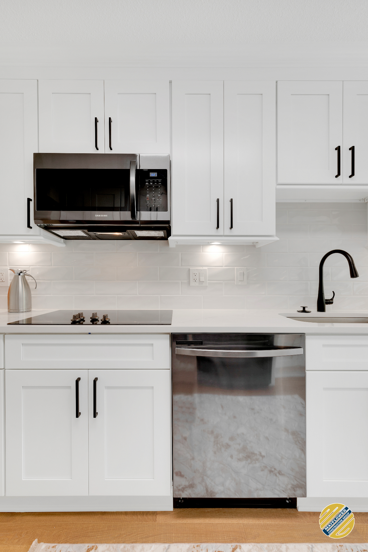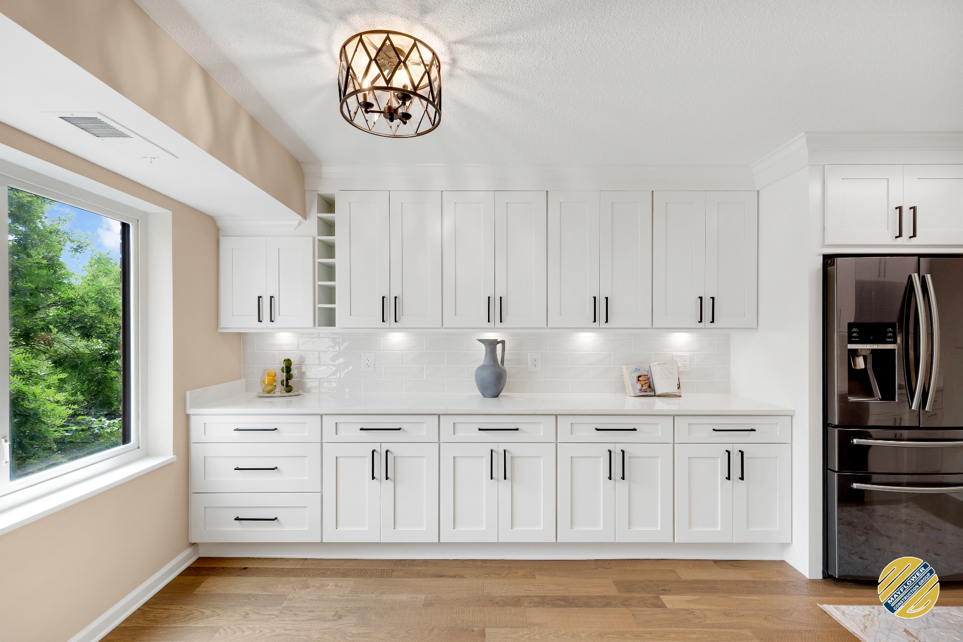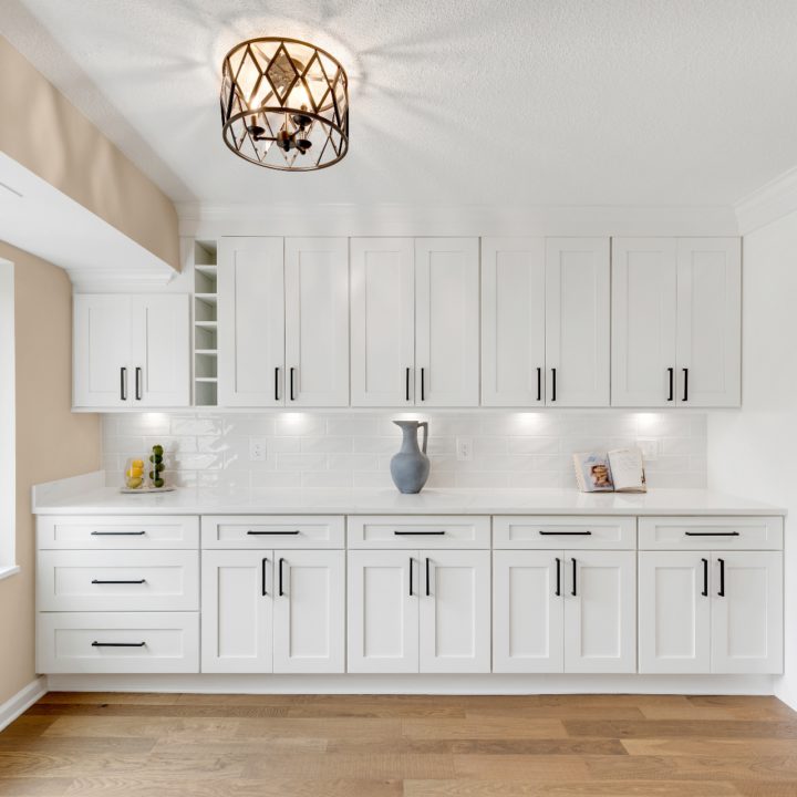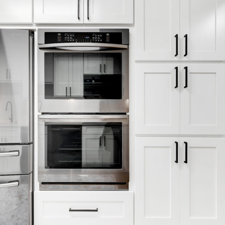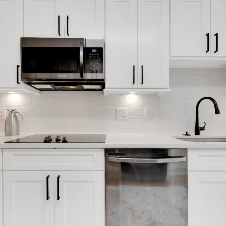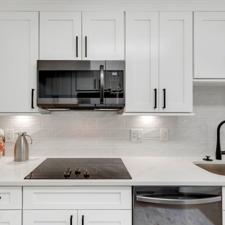 Brighten up your kitchen with white cabinets incorporated with black appliances.