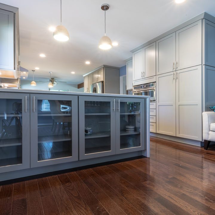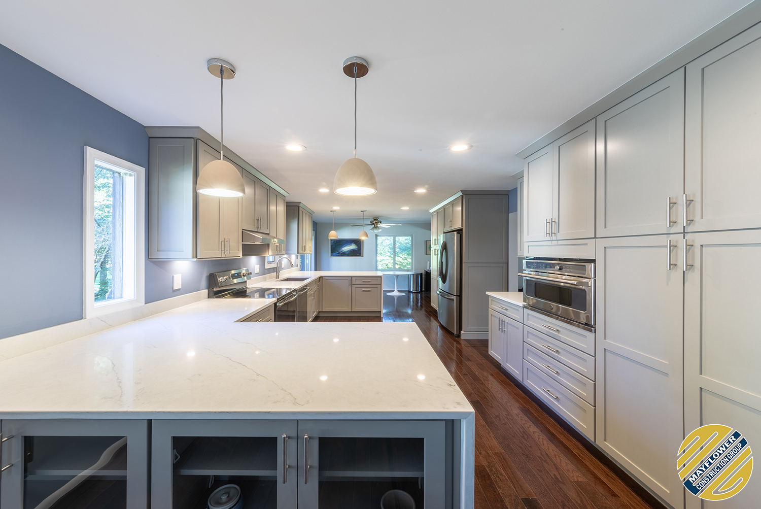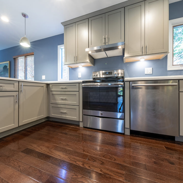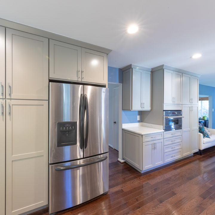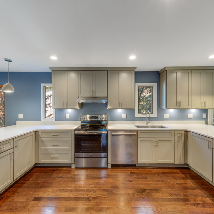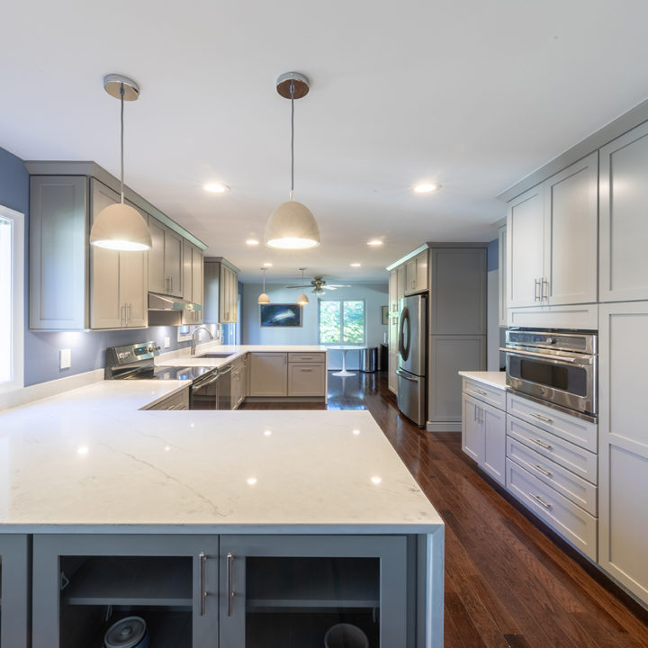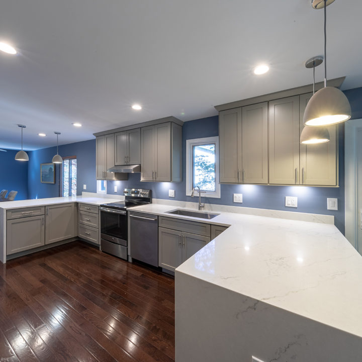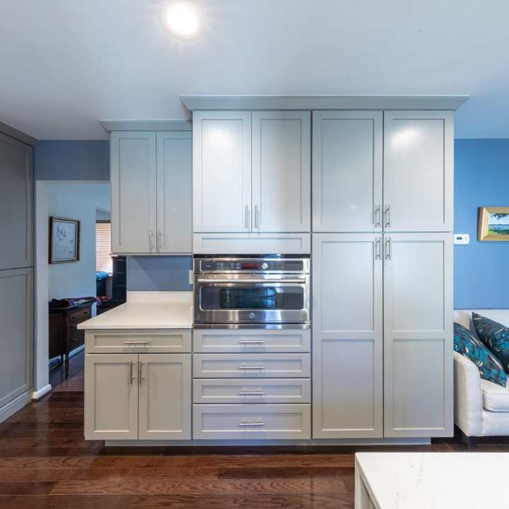 Gray shaker cabinets paired with marble veined quartz countertops with blue wall
