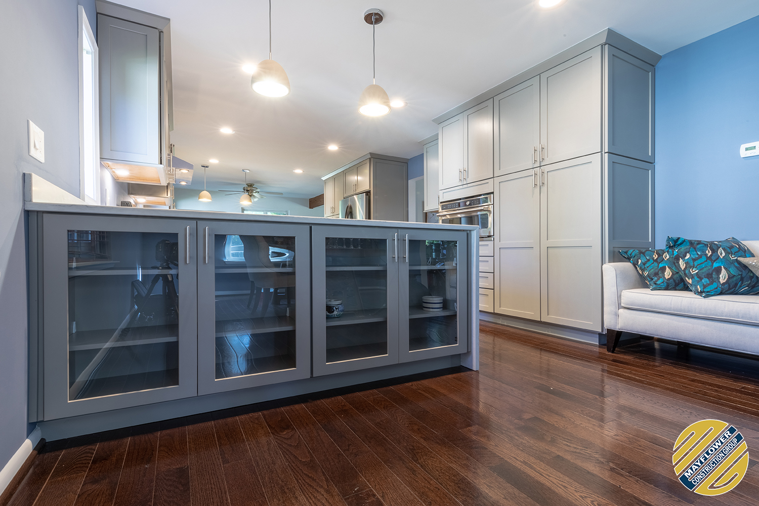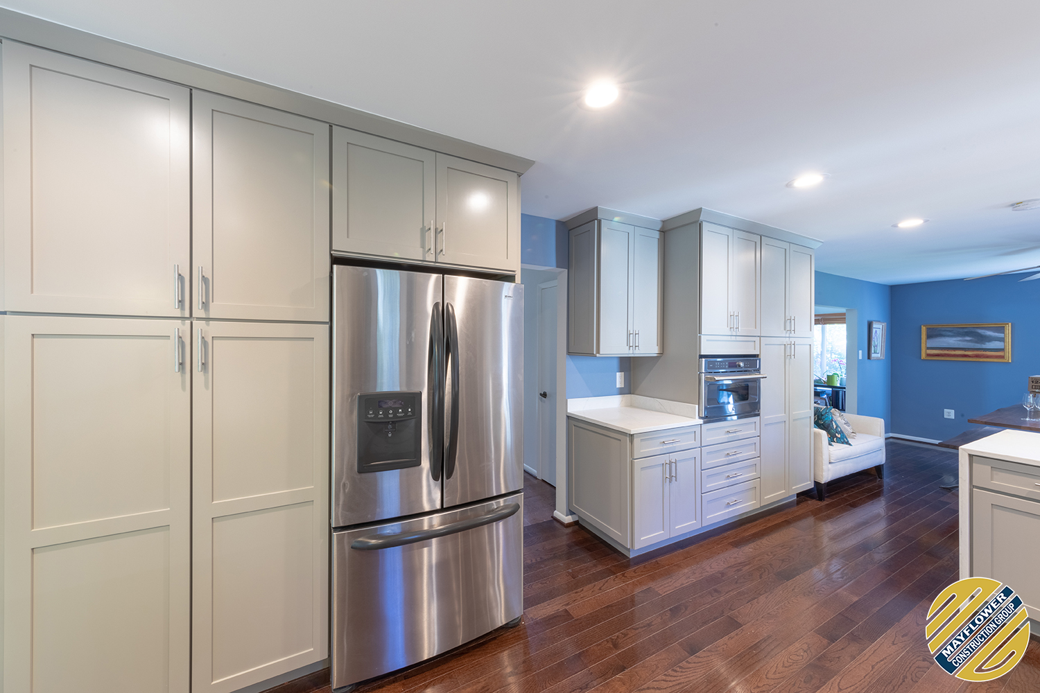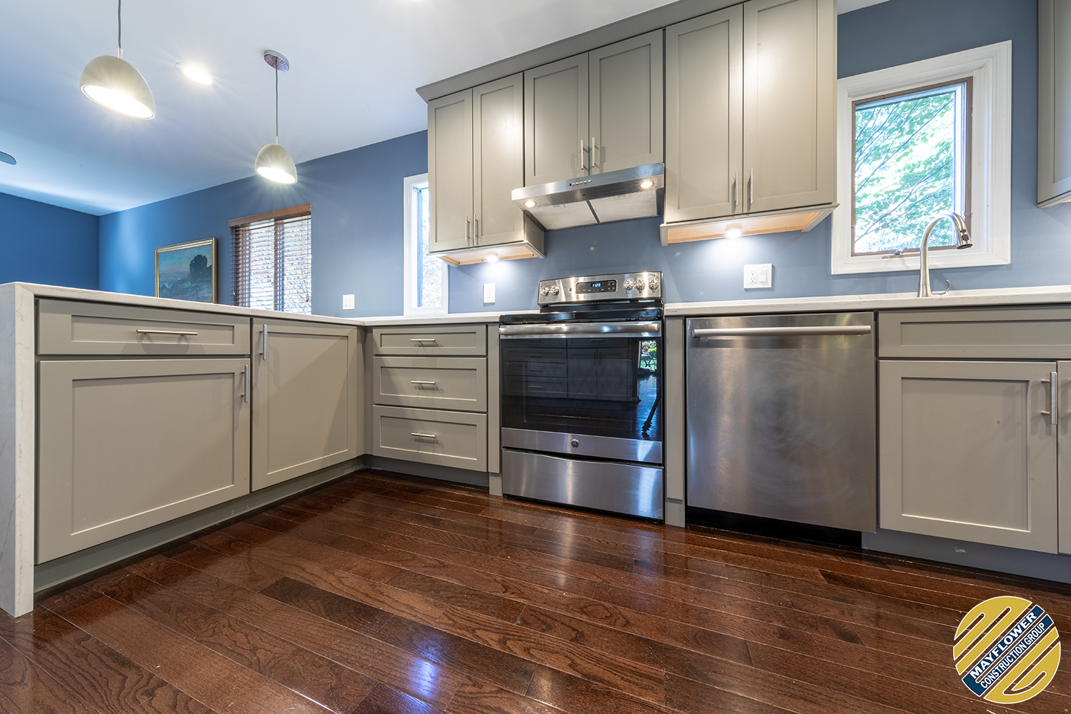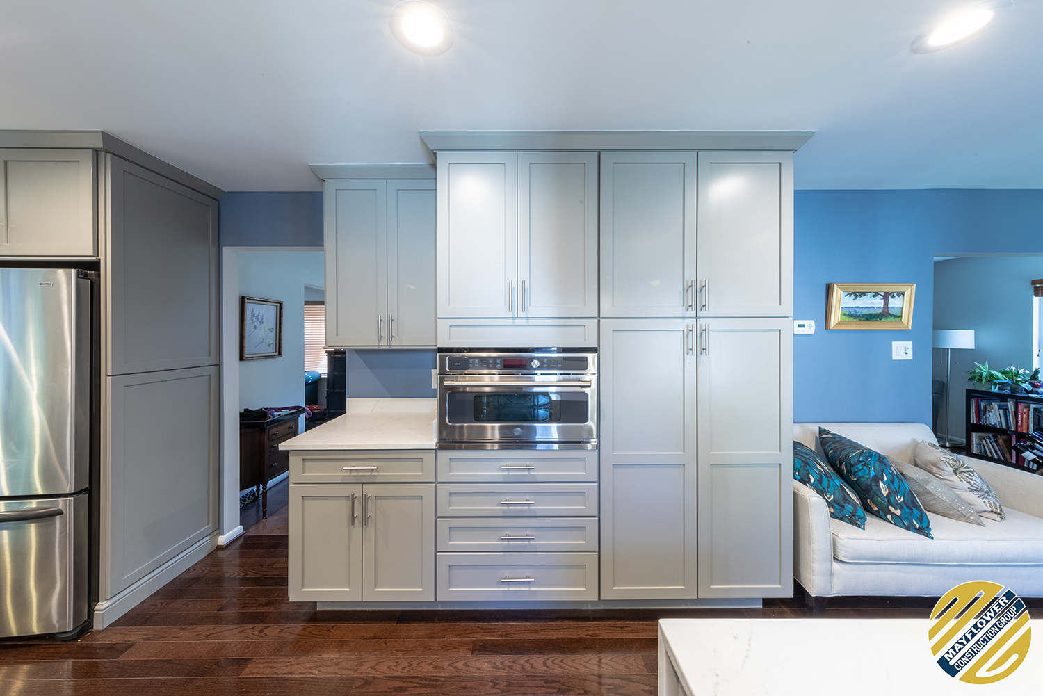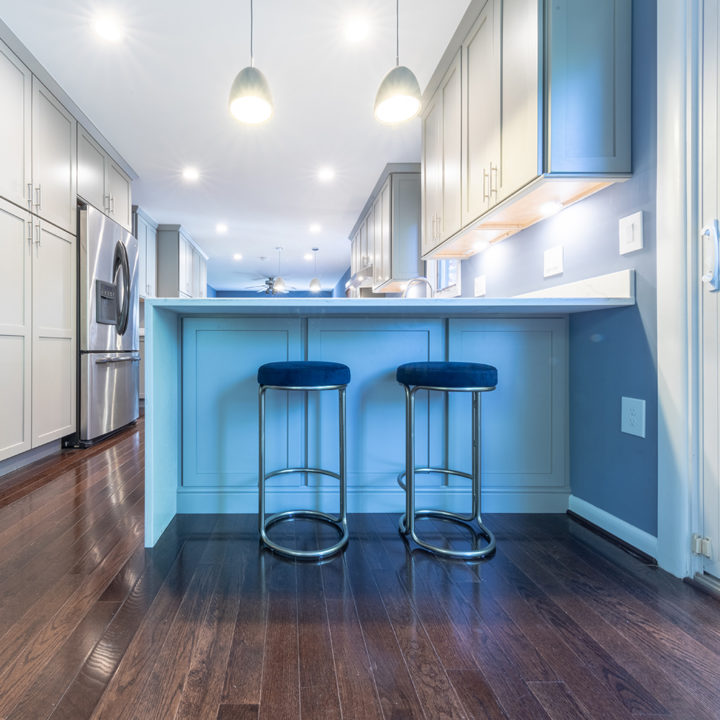 Gray shaker cabinets paired with marble veined quartz countertops with blue wall