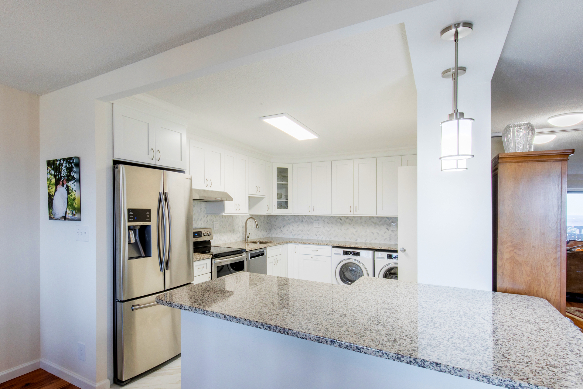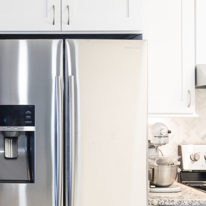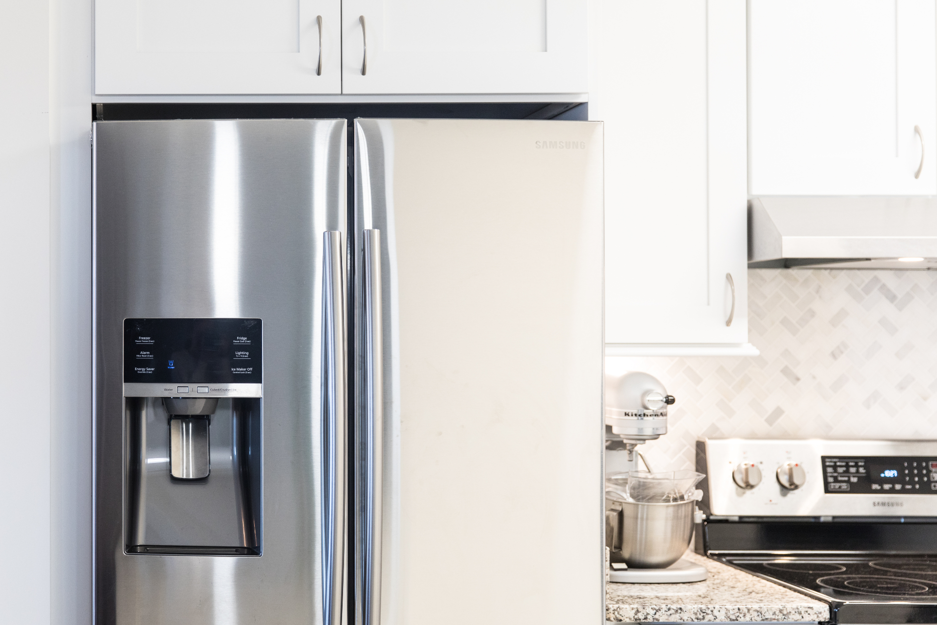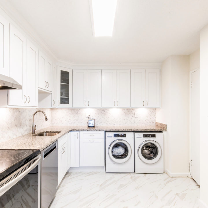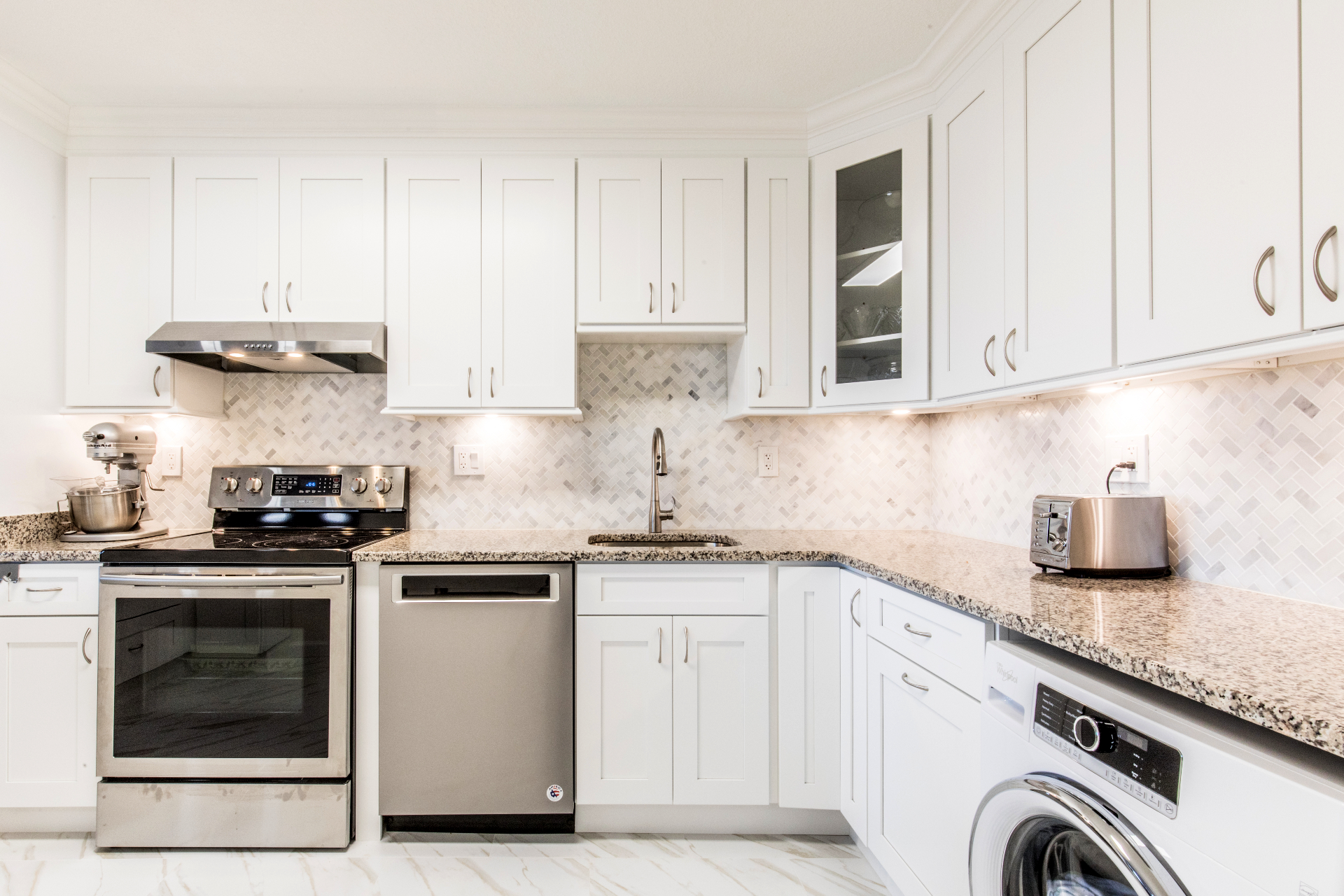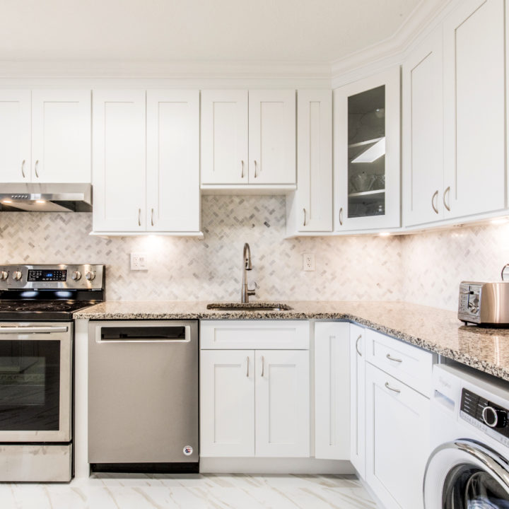 White cabinets with quartz countertop and brushed nickel fixtures.